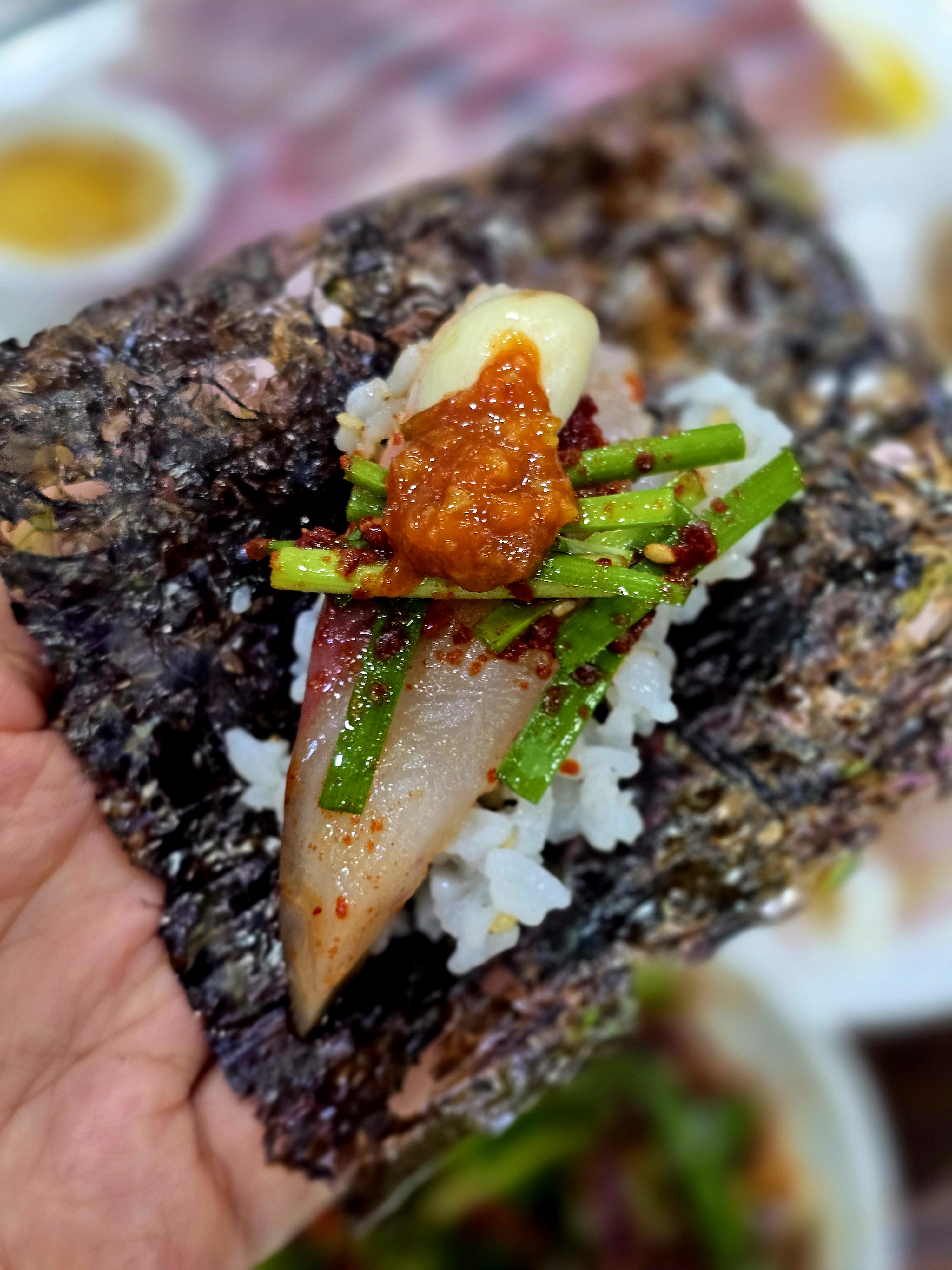 비린내? 전혀 없다. 제주산 고등어 특유의 쫀득함과 고소함이 입안에서 맴돈다. 소금+참기름장에 찍어 먹으면 고등어의 단맛이 배가 된다. 초고추장은 음.. 개인 취향에 따라 넣자.